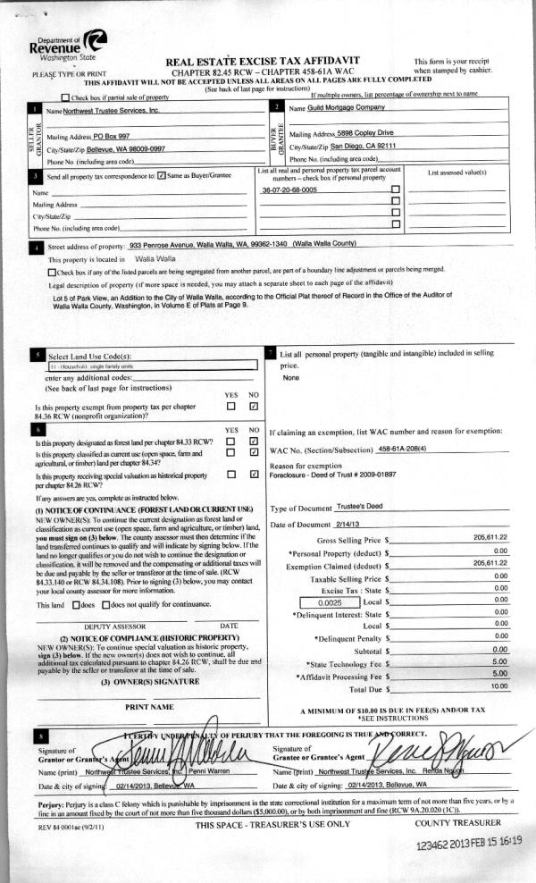 | 3 | 02/15/2013 | WARRANTY D | WARRANTY DEED | NORTHWEST TRUSTEE SERVICES INC | GUILD MORTGAGE COMPANY | | | $205,611.00 | 123462 | 2013-01383 |
