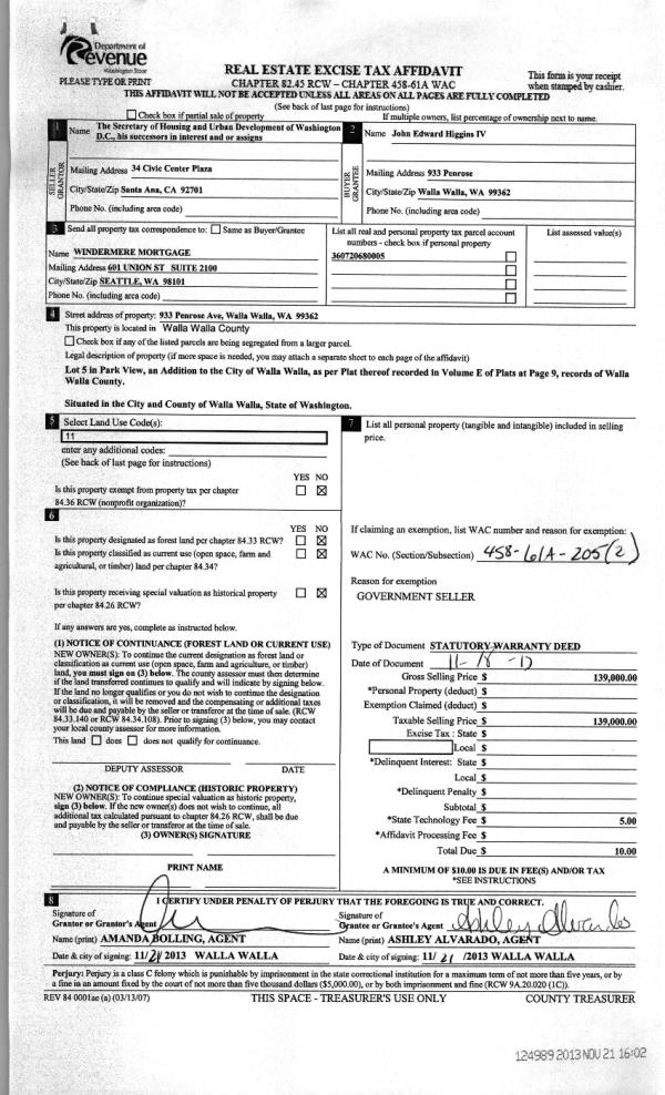 | 1 | 11/21/2013 | WARRANTY D | WARRANTY DEED | THE SECRETARY OF HOUSING & URBAN DEVELOPMENT | HIGGINS JOHN EDWARD IV | | | $139,000.00 | 124989 | 2013-11399 |
