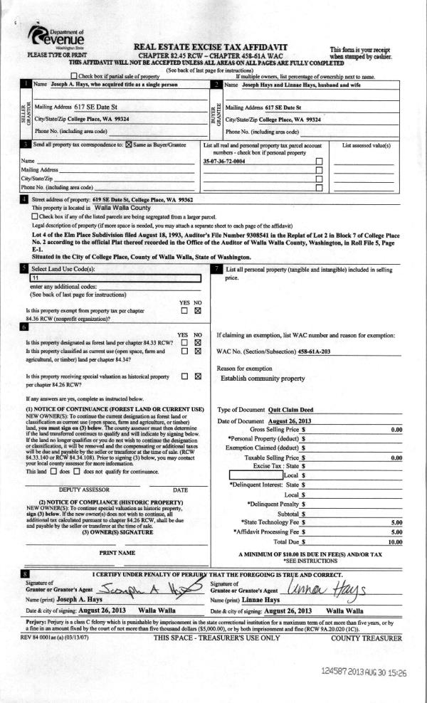 | 2 | 08/30/2013 | QCD | QUIT CLAIM DEED | HAYS, JOSEPH A | HAYS, JOSEPH & LINNAE | | | $0.00 | 124587 | 2013-09002 |