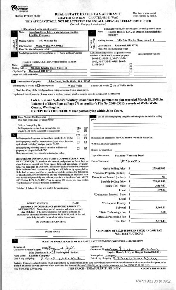 | 4 | 10/10/2013 | WARRANTY D | WARRANTY DEED | JOHN-NEEDHAM LLC | HAYDEN HOMES LLC | 4-PARCELS | | $239,615.00 | 124797 | 2013-10244 |