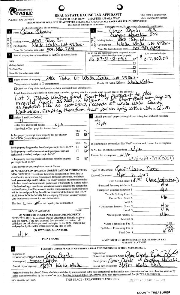 | 1 | 03/08/2017 | QCD | QUIT CLAIM DEED | OGOSHI GRACE M | OGOSHI GRACE | | | $0.00 | 132177 | 2017-02687 |