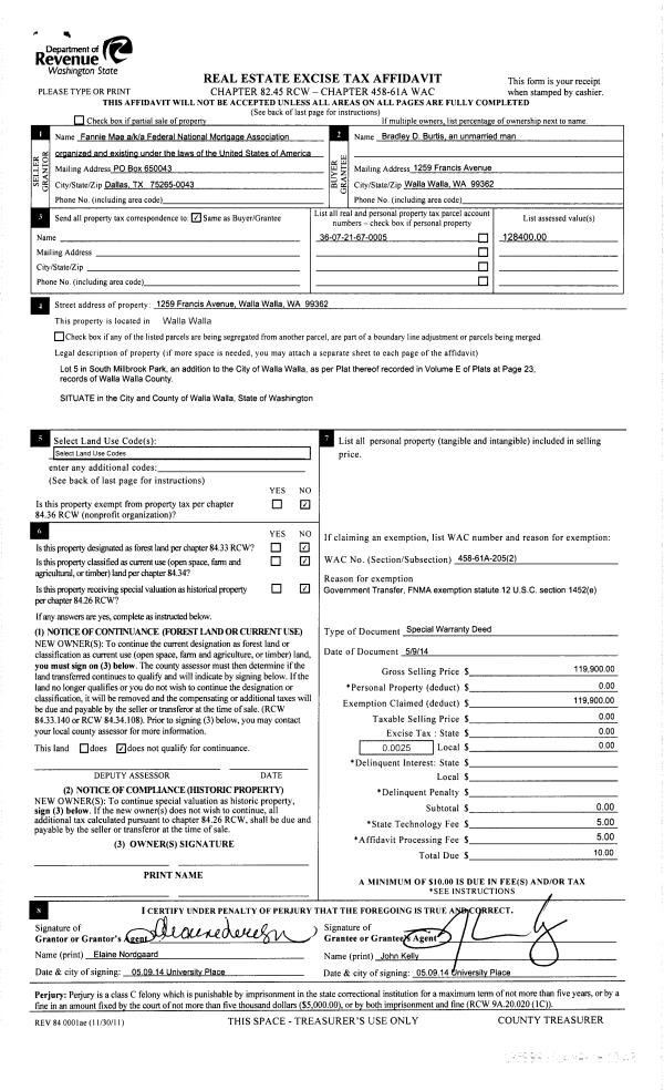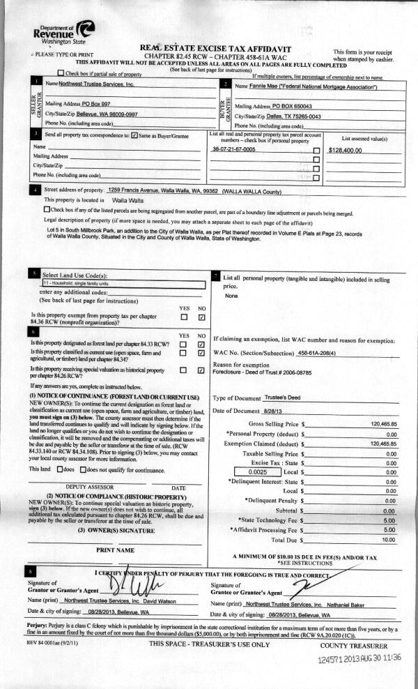 | 4 | 08/30/2013 | WARRANTY D | WARRANTY DEED | NORTHWEST TRUSTEE SERVICES | FEDERAL NATIONAL MORTGAGE~ASSO | | | $120,465.00 | 124571 | 2013-08941 |