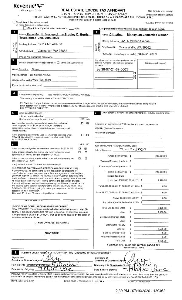 | 1 | 07/10/2020 | SWD | STATUTORY WARRANTY DEED | BRADLEY D BURTIS TRUST | BINNEY CHRISTINA | | | $220,000.00 | 139462 | 2020-06615 |