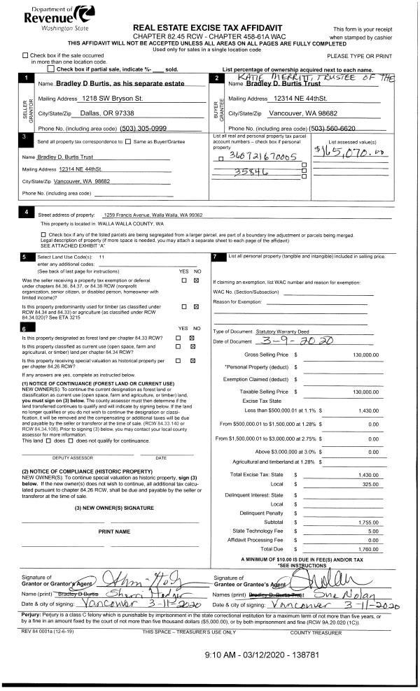 | 2 | 03/12/2020 | SWD | STATUTORY WARRANTY DEED | BURTIS BRADLEY D | BRADLEY D BURTIS TRUST | | | $130,000.00 | 138781 | 2020-02265 |
