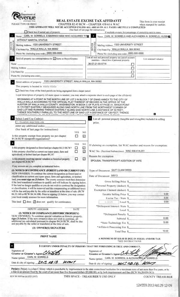 | 1 | 09/13/2013 | QCD | QUIT CLAIM DEED | SORRELS, CARL W | SORRELS, CARL W & ALEXANDRIA N | | | $0.00 | 124559 | 2013-09434 |