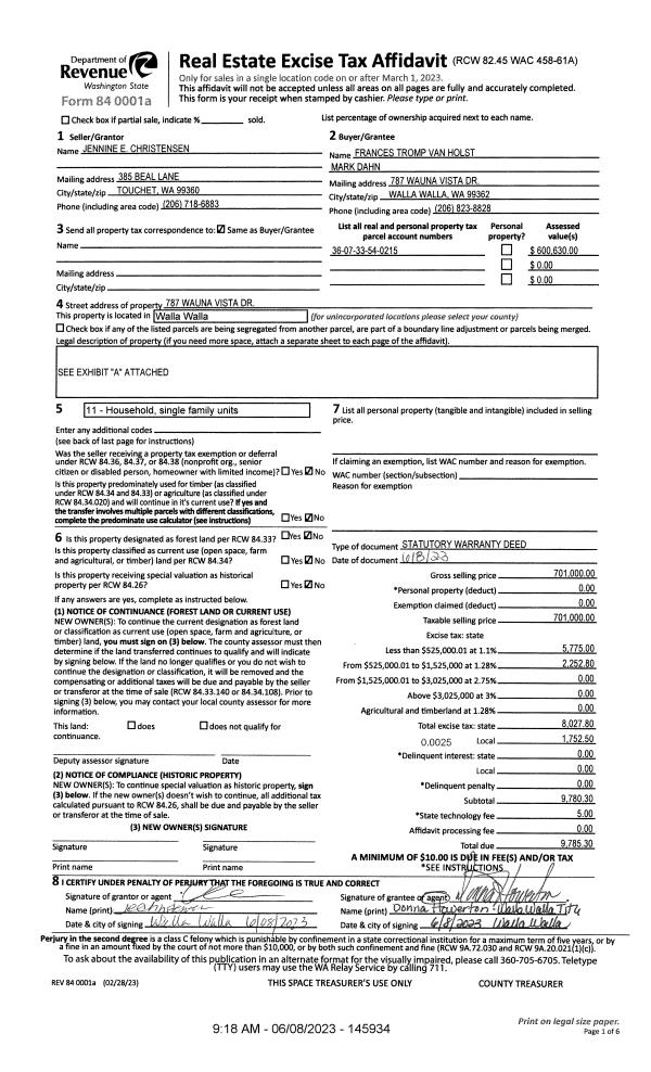 | 1 | 06/08/2023 | SWD | STATUTORY WARRANTY DEED | CHRISTENSEN JENNINE E | VAN HOLST FRANCES TROMP & MARK DAHN | | | $701,000.00 | 145934 | 2023-03121 |