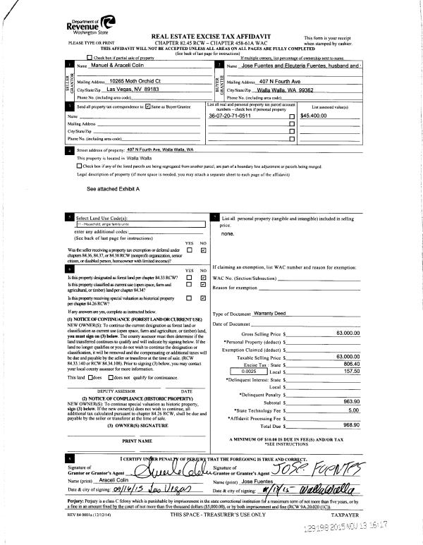 | 1 | 11/13/2015 | SWD | STATUTORY WARRANTY DEED | COLIN MANUEL & ARACELI | FUENTES JOSE & ELEUTERIA | | | $63,000.00 | 129198 | 2015-09903 |