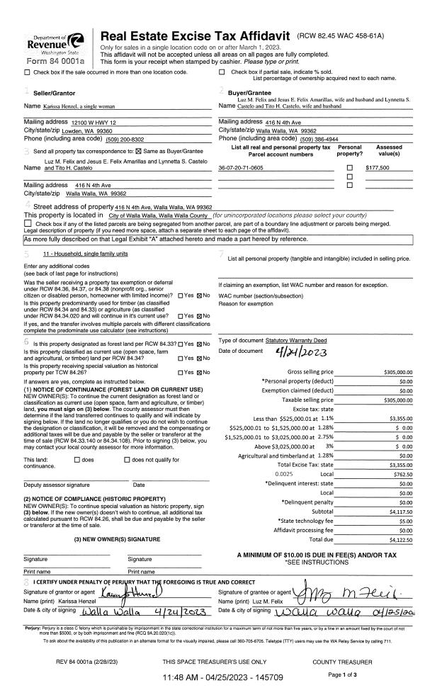 | Mailing Address: | LYNNETTA S CASTELO & TITO H CASTELO 416 N 4TH AVE WALLLA WALLA, WA 99362 | % Ownership: | 100.0000000000% |