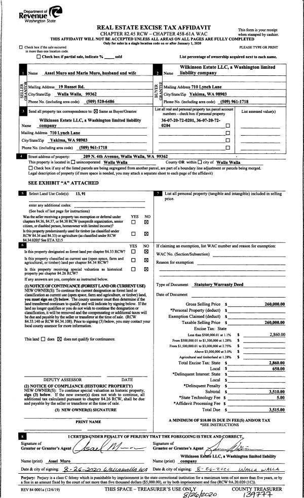 | 1 | 08/26/2020 | SWD | STATUTORY WARRANTY DEED | MURO ASAEL J & MARIA G | WILKINSON ESTATE LLC | | 2-PARCELS | $260,000.00 | 139777 | 2020-08570 |