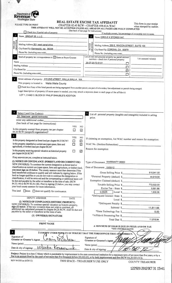 | 1 | 10/31/2012 | WARRANTY D | WARRANTY DEED | GROUP 35 LLC | CIRCLE K STORES INC | | | $816,841.00 | 122920 | 2012-09675 |