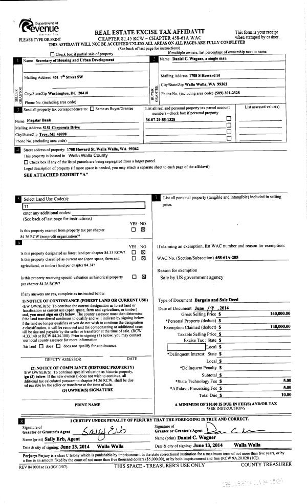 | 1 | 06/24/2014 | BARGAIN & | BARGAIN & SALE DEED | SECRETARY OF HOUSING & URBAN DEVELOPMENT | WAGNER DAN C | | | $140,000.00 | 126119 | 2014-04343 |