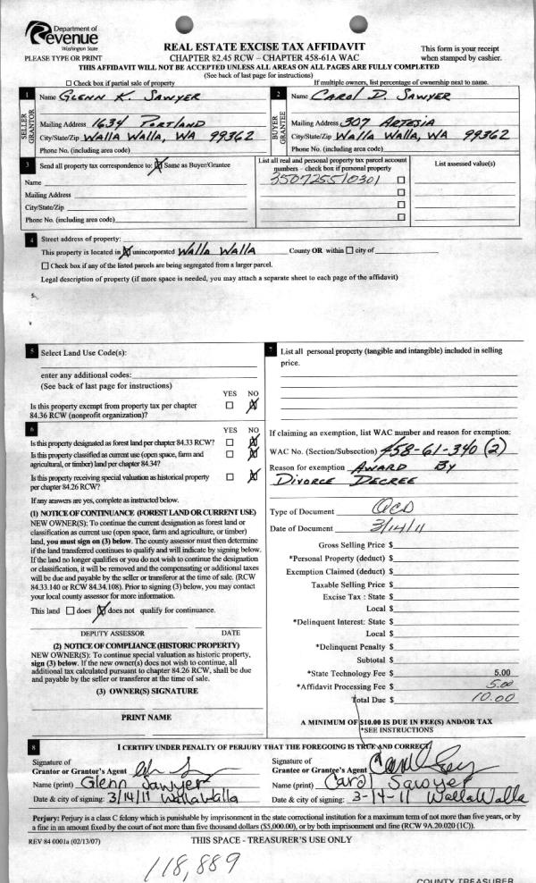 | 3 | 03/16/2011 | QCD | QUIT CLAIM DEED | SAWYER, GLENN | SAWYER, CAROL D | | | | 119889 | 2011-02326 |