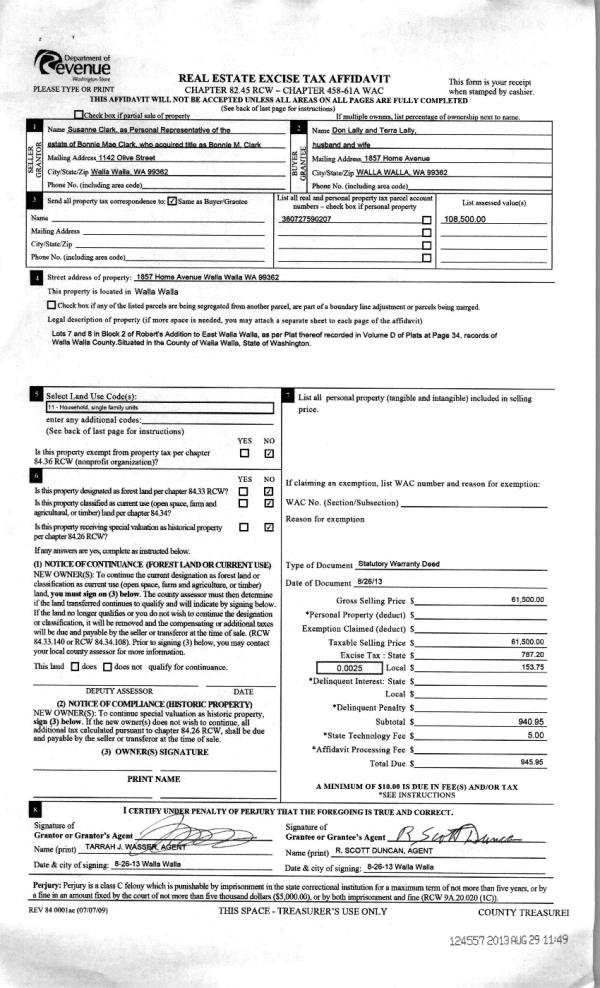 | 2 | 08/29/2013 | WARRANTY D | WARRANTY DEED | CLARK, NORBERT T & BONNIE MAE | LALLY, DON & TERRA J | | | $61,500.00 | 124557 | 2013-08908 |