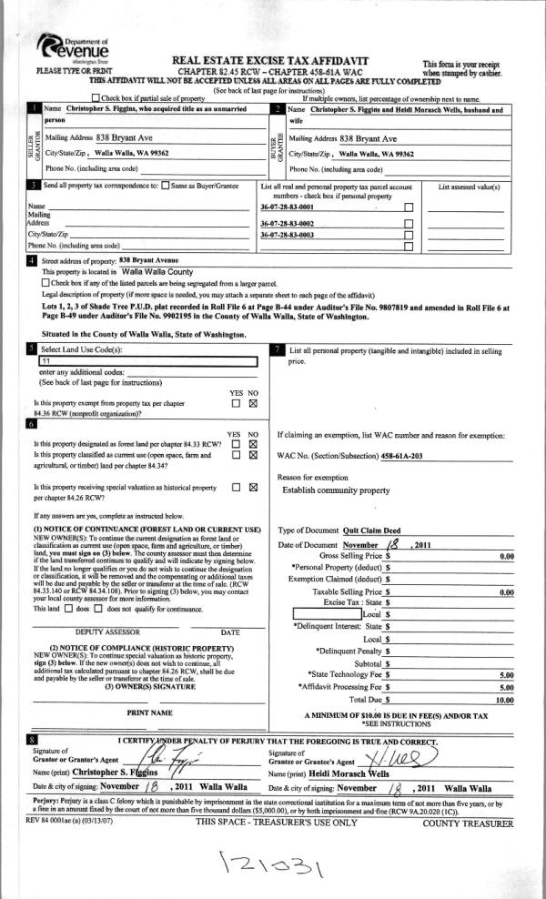 | 3 | 11/22/2011 | QCD | QUIT CLAIM DEED | FIGGINS, CHRISTOPHER S | FIGGINS CHRISTOPHER S | | | | 121031 | 2011-09205 |