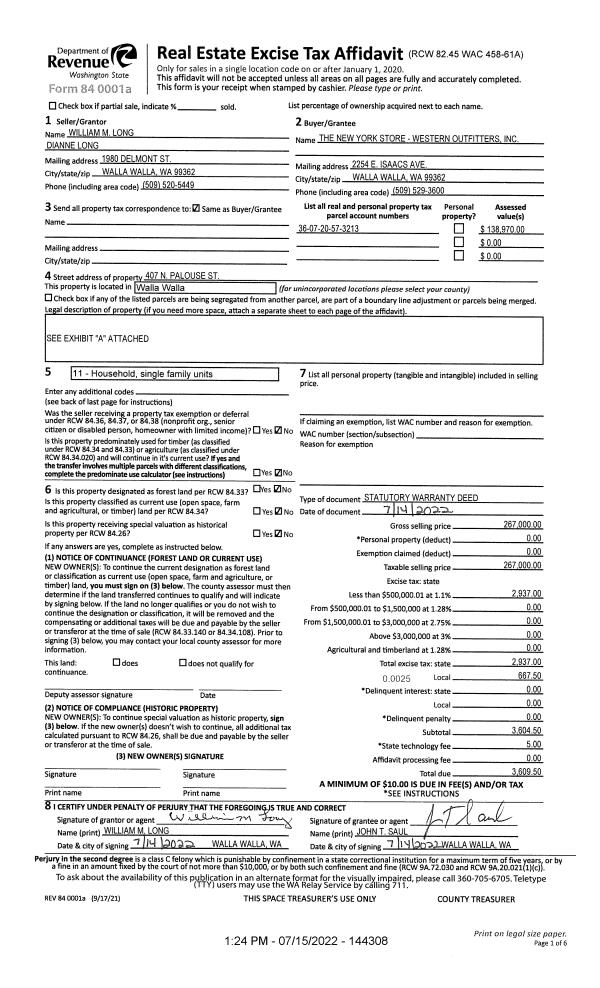| 1 | 07/15/2022 | SWD | STATUTORY WARRANTY DEED | LONG WILLIAM M & DIANNE | THE NEW YORK STORE-WESTERN OUTFITTERS INC | | | $267,000.00 | 144308 | 2022-06026 |