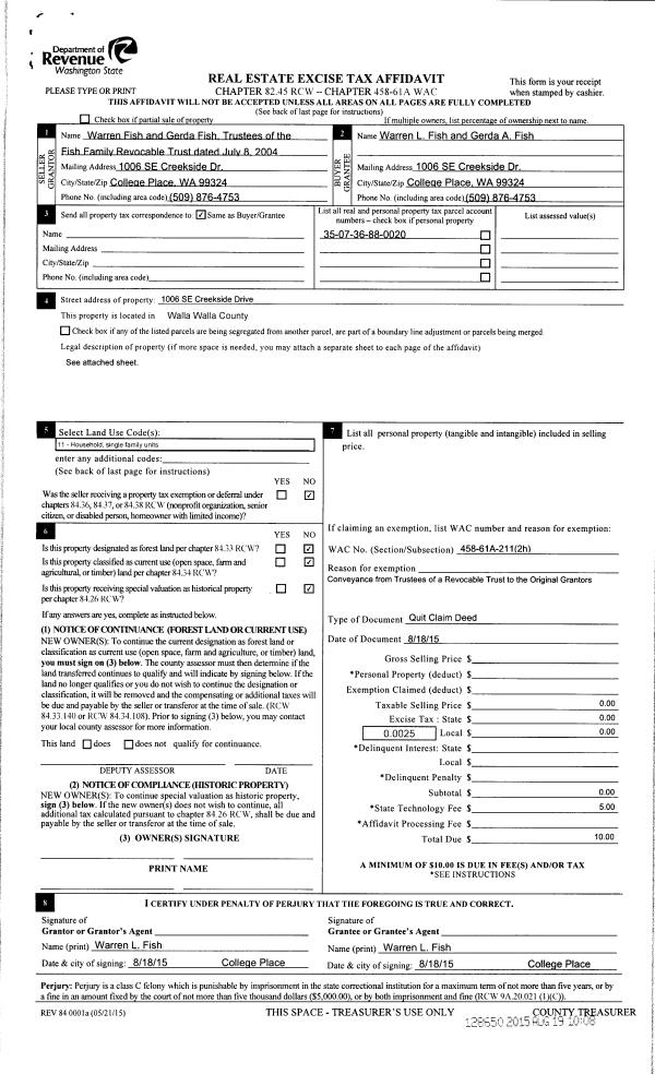 | 4 | 08/18/2015 | QCD | QUIT CLAIM DEED | FISH FAMILY REVOCABLE TRUST | FISH WARREN L & GERDA A | | | $0.00 | 128650 | 2015-07254 |