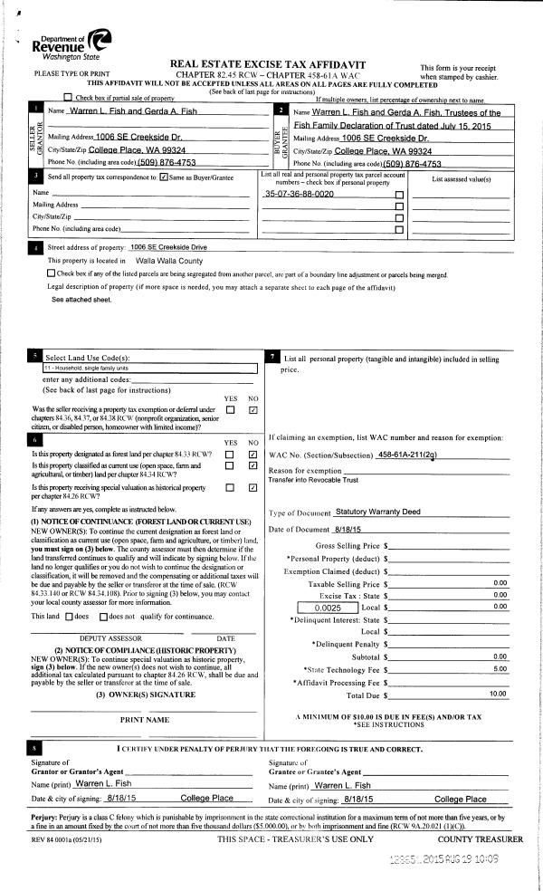 | 3 | 08/18/2015 | SWD | STATUTORY WARRANTY DEED | FISH WARREN L & GERDA A | FISH FAMILY DECLARATION OF TRUST | | | $0.00 | 128651 | 2015-07255 |