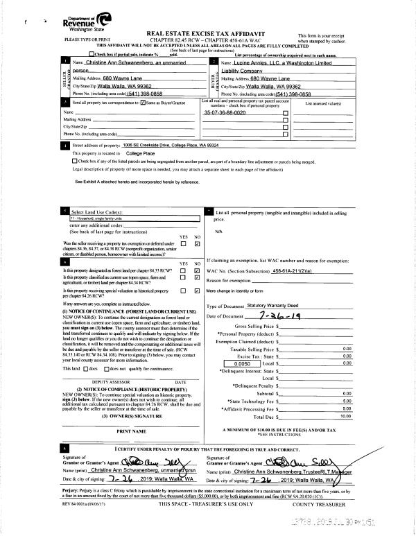| 1 | 07/26/2019 | SWD | STATUTORY WARRANTY DEED | SCHWANENBERG CHRISTINE ANN | LUPINE ANNIES LLC | | | $0.00 | 137381 | 2019-05592 |