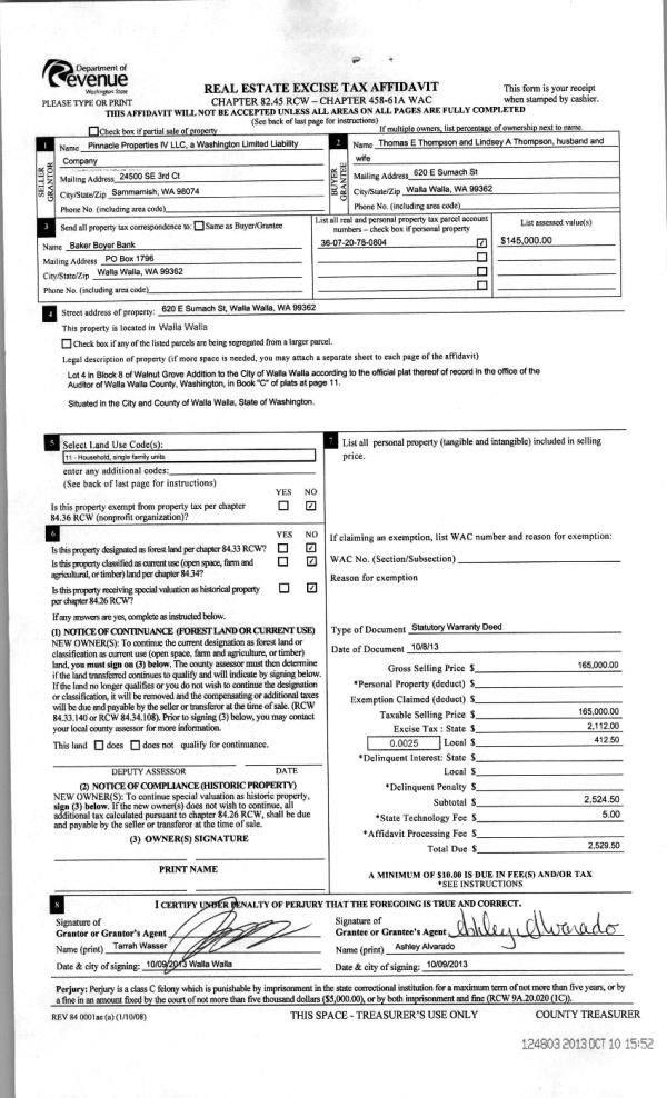 | 3 | 10/10/2013 | WARRANTY D | WARRANTY DEED | PINNACLE PROPERTIES IV LLC | THOMPSON, THOMAS E & LINDSEY A | | | $165,000.00 | 124803 | 2013-10275 |