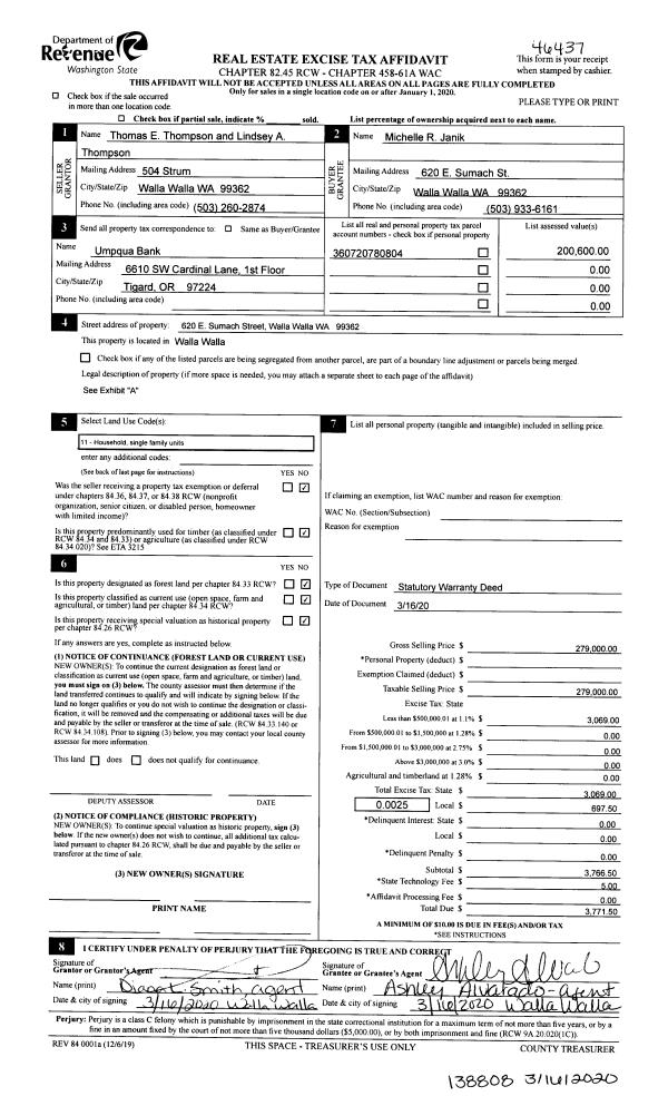 | 2 | 03/16/2020 | SWD | STATUTORY WARRANTY DEED | THOMPSON THOMAS E & LINDSEY A | JANIK MICHELLE R | | | $279,000.00 | 138808 | 2020-02402 |