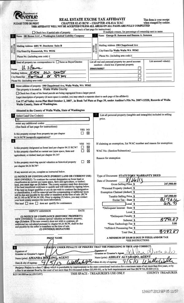 | 2 | 09/05/2013 | WARRANTY D | WARRANTY DEED | S R HOMES LLC | JAMESON, GEORGE H & DEANNA A | | | $247,900.00 | 124607 | 2013-09157 |