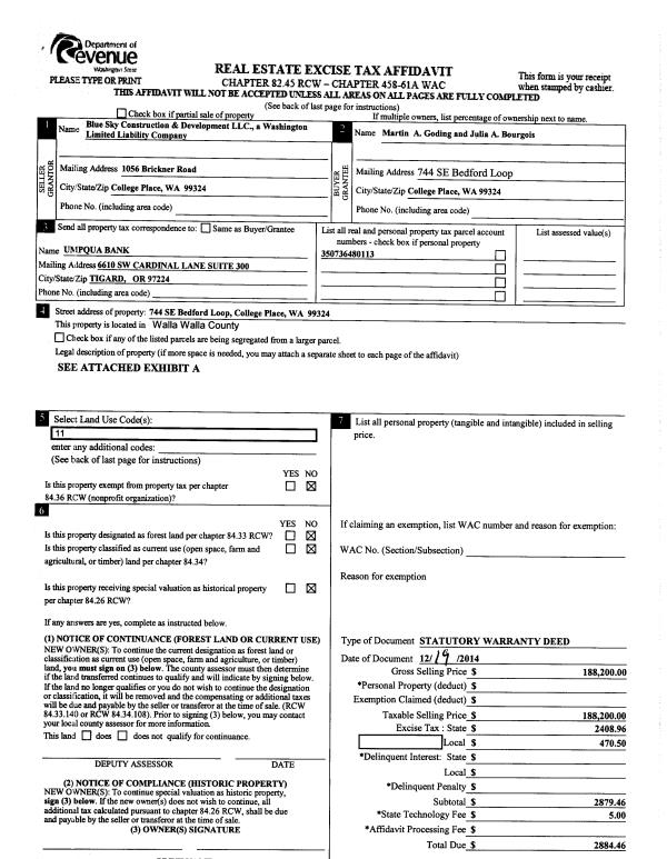 | 3 | 12/22/2014 | SWD | STATUTORY WARRANTY DEED | BLUE SKY CONSTRUCTION & DEVELOPMENT LLC | GODING MARTIN A | | | $188,200.00 | 127161 | 2014-09288 |