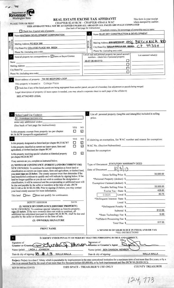| 4 | 10/03/2013 | WARRANTY D | WARRANTY DEED | WHITMAN DEVELOPMENT CORP | BLUE SKY CONSTRUCTION &~DEVELO | | | $33,500.00 | 124773 | 2013-10070 |
