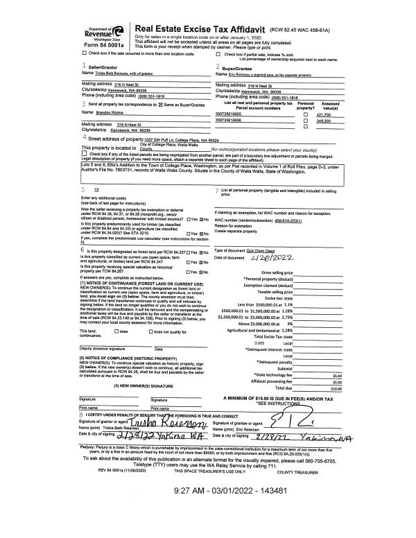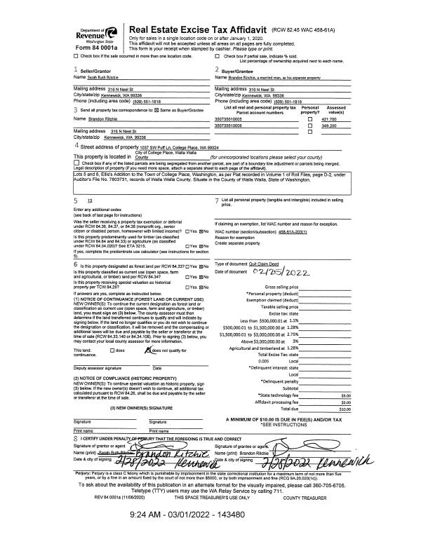 | 1 | 03/01/2022 | QCD | QUIT CLAIM DEED | | RITCHIE BRANDON | | 2-PARCELS | $0.00 | 143481 | 2022-01790 |