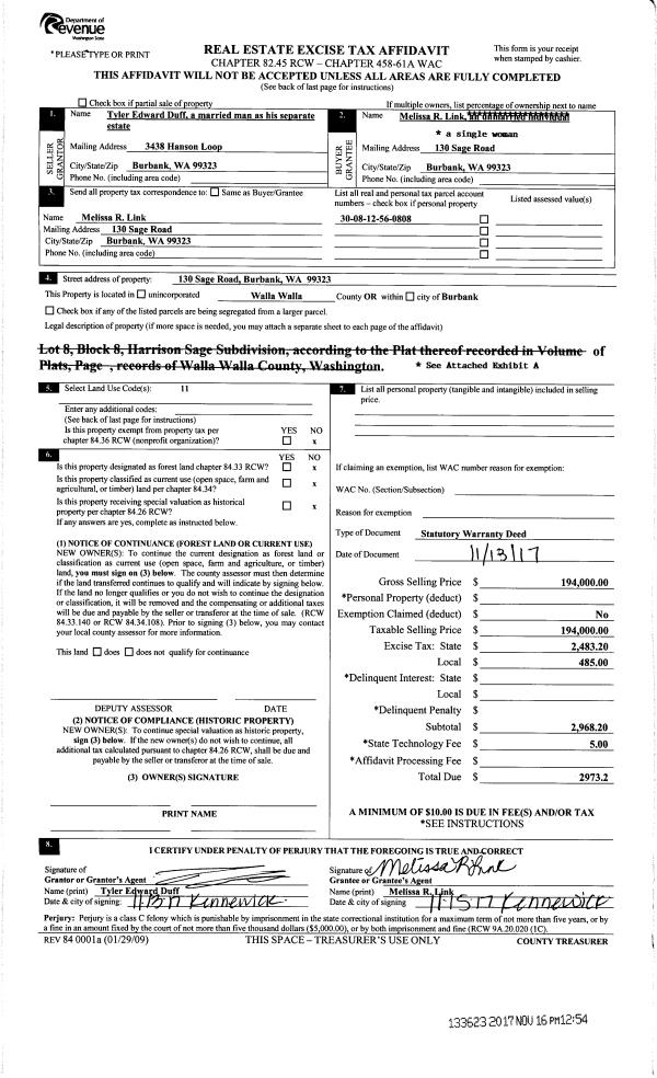 | 1 | 11/16/2017 | SWD | STATUTORY WARRANTY DEED | DUFF TYLER EDWARD | LINK MELISSA R | | | $194,000.00 | 133623 | 2017-09244 |