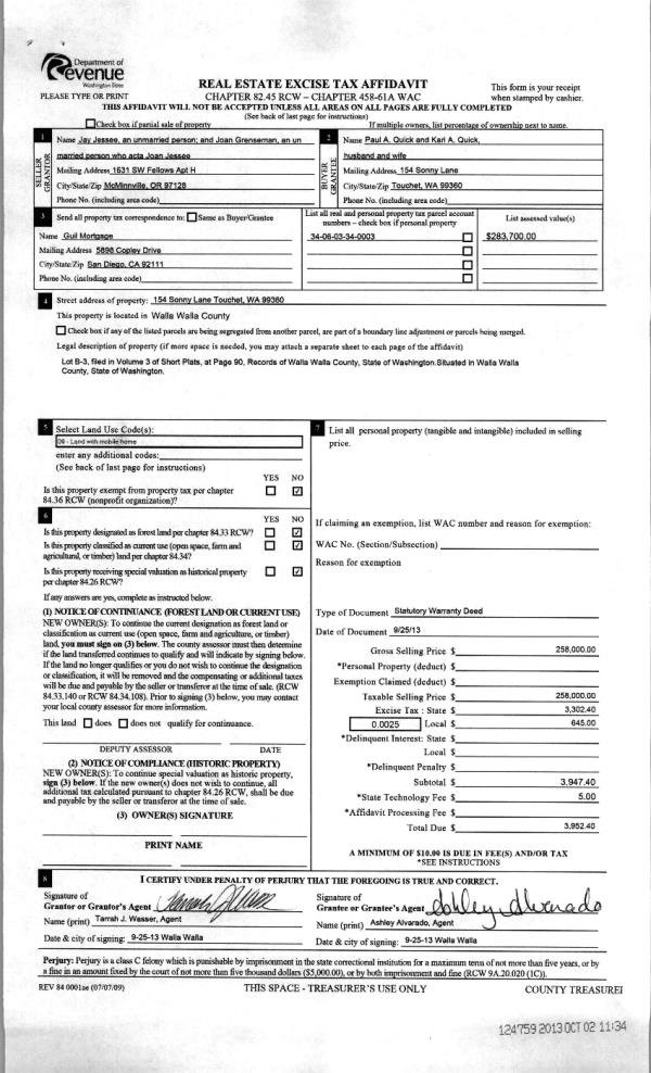 | 2 | 10/02/2013 | WARRANTY D | WARRANTY DEED | JESSEE, JAY | QUICK, PAUL A & KARI A | | | $258,000.00 | 124759 | 2013-10012 |