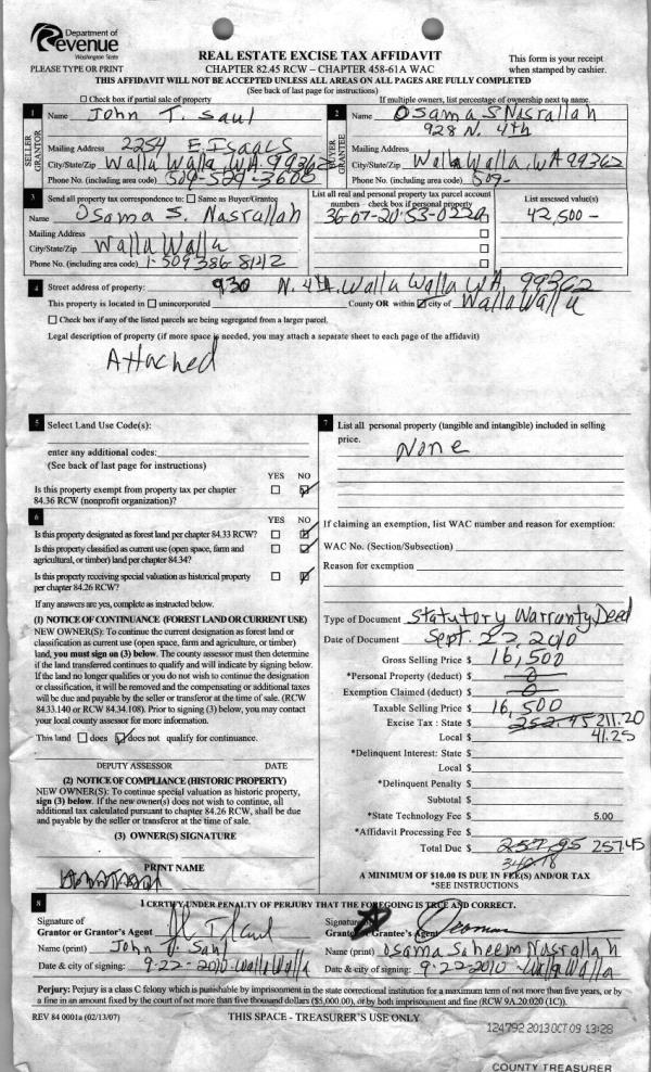| 2 | 10/09/2013 | WARRANTY D | WARRANTY DEED | SAUL, JOHN T | NASRALLAH, OSAMA | | | $16,500.00 | 124792 | 2013-10229 |