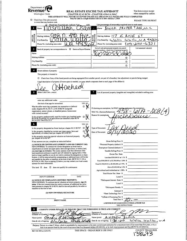 | 1 | 02/11/2020 | TAX AFF | TAX AFFIDAVIT | NASRALLAH OSAMA | BLOCK PROPERTIES LLC | | | $0.00 | 138673 | 2020-01696 |