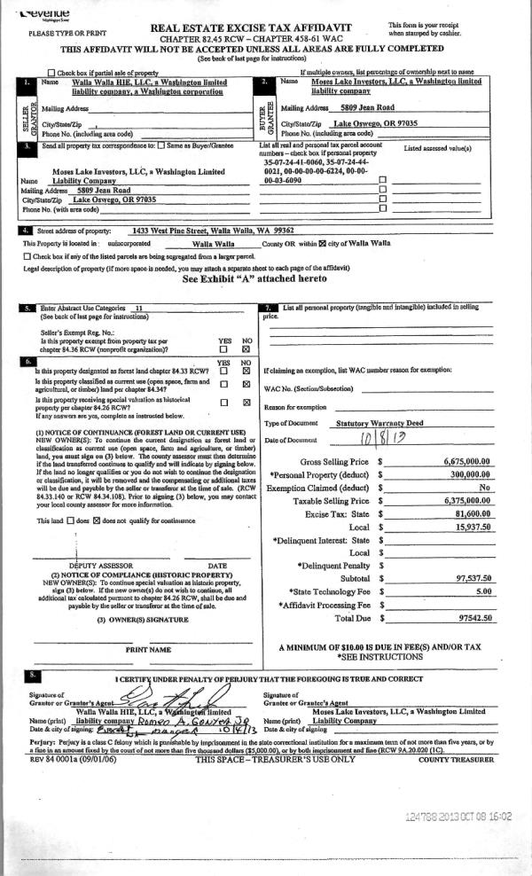 | 1 | 10/08/2013 | WARRANTY D | WARRANTY DEED | WALLA WALLA HIE LLC | MOSES LAKE INVESTORS LLC | 2-PARCELS | | $6,675,000.00 | 124788 | 2013-10209 |