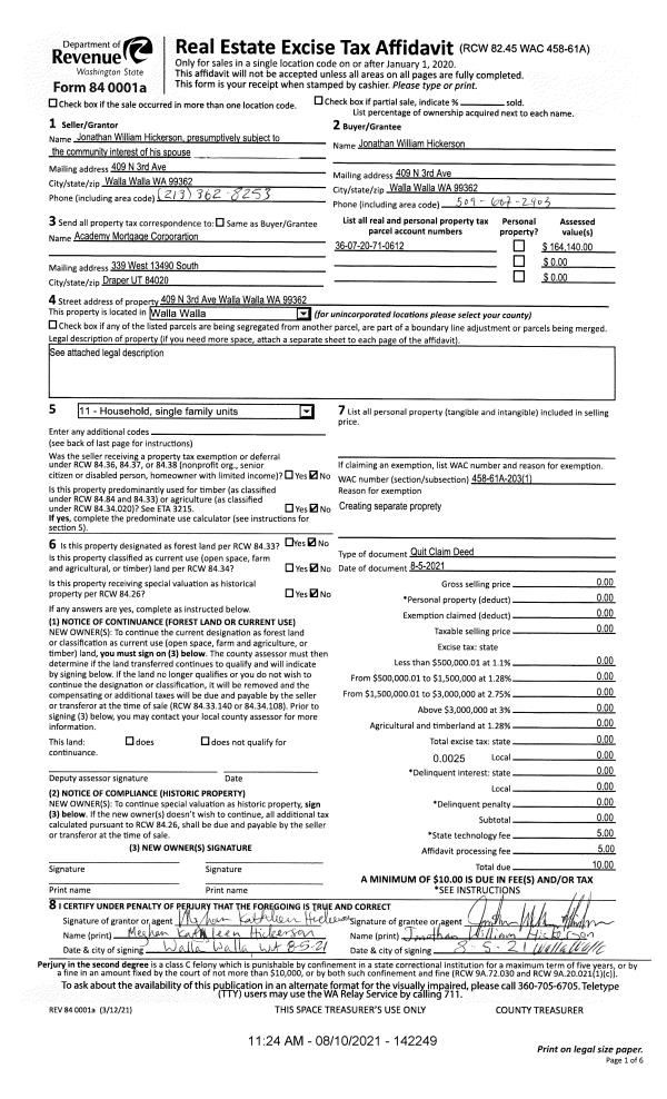 | 2 | 08/05/2021 | QCD | QUIT CLAIM DEED | HICKERSON JONATHAN | HICKERSON JONATHAN WILLIAM | | | $0.00 | 142249 | 2021-09709 |