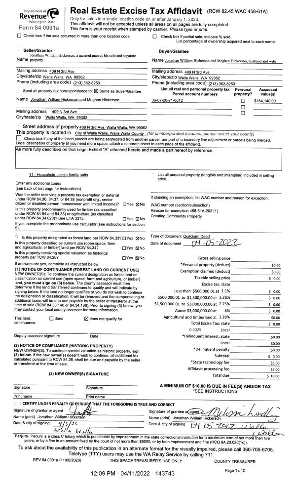 | 1 | 04/05/2022 | QCD | QUIT CLAIM DEED | HICKERSON JONATHAN WILLIAM | HICKERSON JONATHAN WILLIAM & MEGHAN | | | $0.00 | 143743 | 2022-02993 |