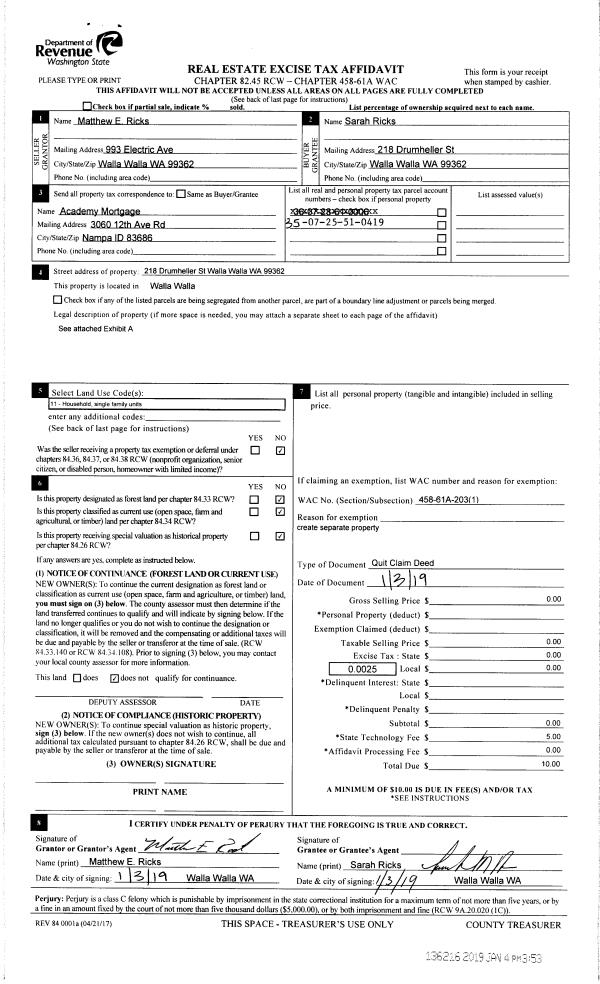 | 2 | 01/04/2019 | QCD | QUIT CLAIM DEED | RICKS MATTHEW E | RICKS SARAH | | | | 136216 | 2019-00072 |