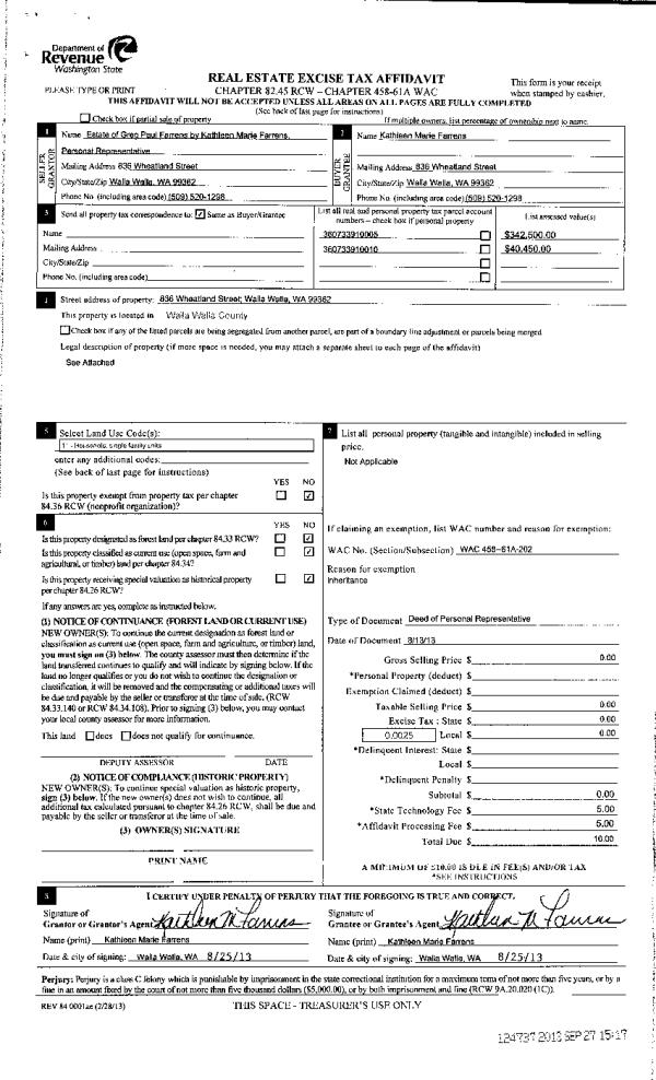 | 2 | 09/27/2013 | WARRANTY D | WARRANTY DEED | "FARRENS, GREG PAUL ESTATE~OF" | | | | | 124737 | 2013-09874 |