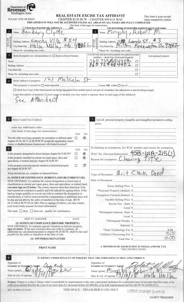 | 3 | 09/10/2018 | QCD | QUIT CLAIM DEED | BARKER CLYDE & DEBRA | MURPHY ROBERT MICHAEL | | | $0.00 | 135505 | 2018-07465 |