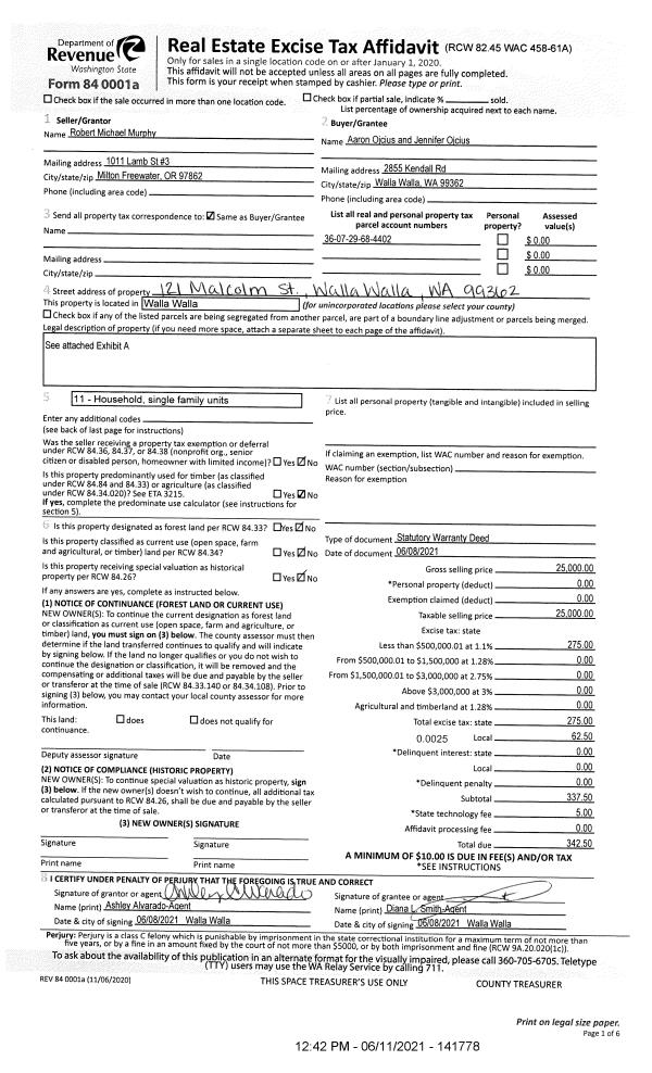 | 2 | 06/11/2021 | SWD | STATUTORY WARRANTY DEED | MURPHY ROBERT MICHAEL | OJCIUS AARON & JENNIFER | | | $25,000.00 | 141778 | 2021-07158 |