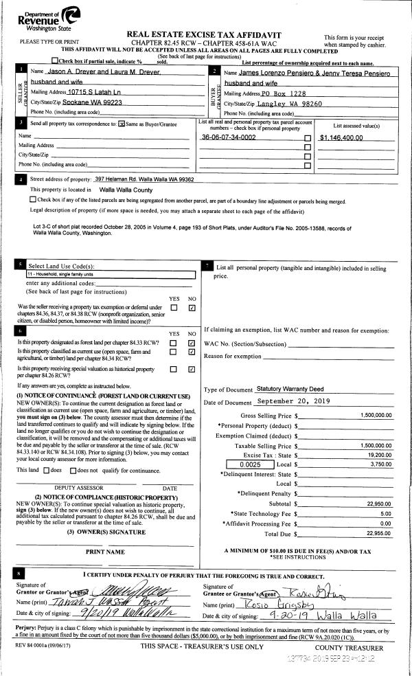 | 1 | 09/23/2019 | SWD | STATUTORY WARRANTY DEED | DREYER JASON A & LAURA M | PENSIERO JAMES LORENZO | | | $1,500,000.00 | 137734 | 2019-07514 |