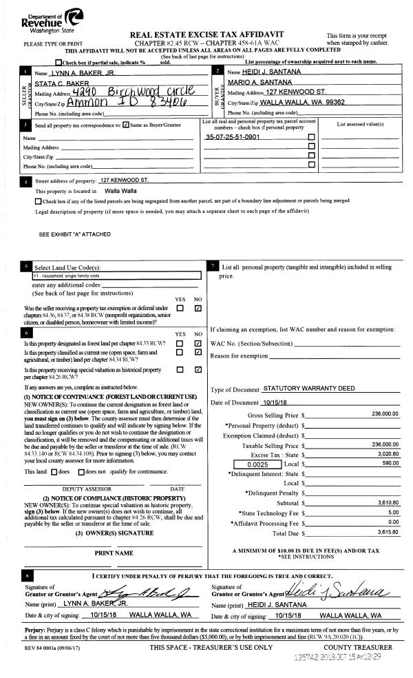 | 1 | 10/15/2018 | SWD | STATUTORY WARRANTY DEED | BAKER LYNN A & STATA C | SANTANA MARIO A & HEIDI J | | | $236,000.00 | 135742 | 2018-08550 |