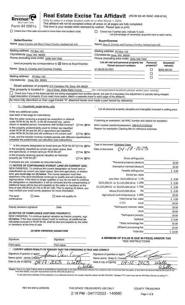 | 1 | 04/17/2023 | QCD | QUIT CLAIM DEED | CROWLEY JAMES & MARY COLEEN | CROWLEY SHEA G & COURTNEY | | | $0.00 | 145680 | 2023-02019 |