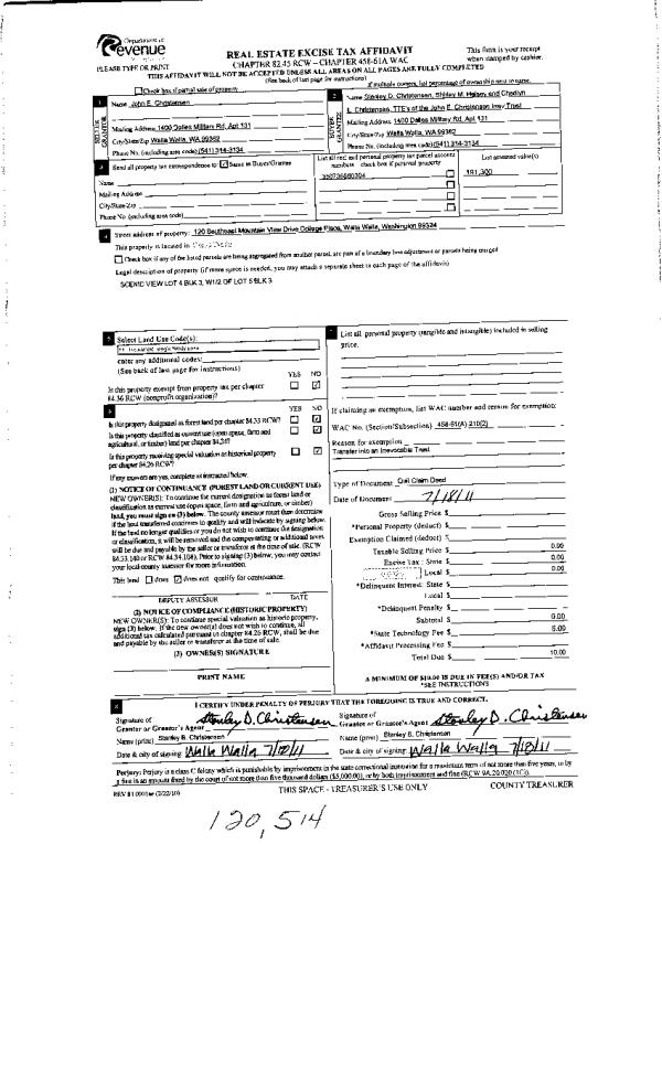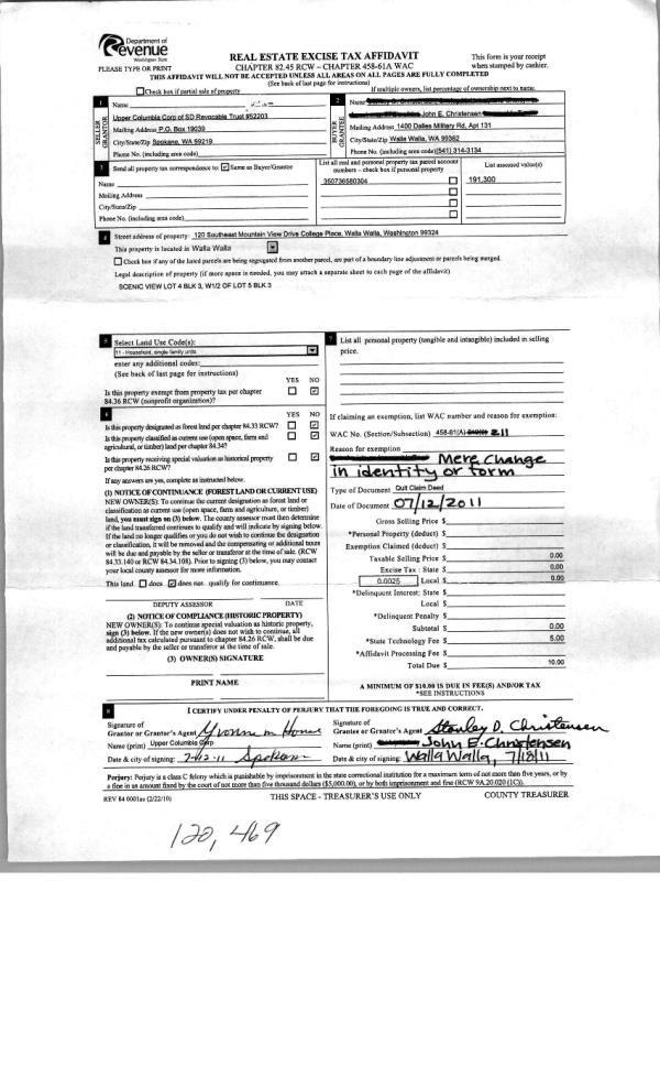 | 6 | 07/28/2011 | QCD | QUIT CLAIM DEED | UPPER COLUMBIA CORP OF SDA TRU | CHRISTENSEN, JOHN E | | | | 120469 | 2011-05847 |