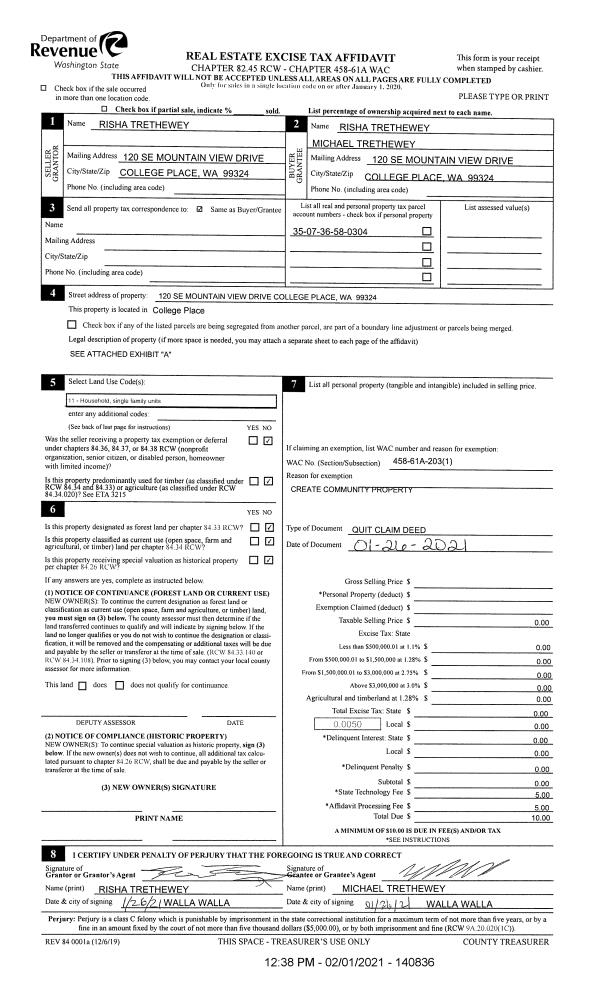 | 2 | 01/26/2021 | QCD | QUIT CLAIM DEED | OPP RISHA | TRETHEWEY RISHA & MICHAEL | | | $0.00 | 140836 | 2021-01219 |