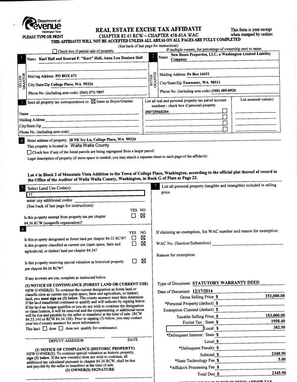 | 1 | 12/17/2014 | SWD | STATUTORY WARRANTY DEED | HALL ANNA LOU DENISON LIFE ESTATE | NEW ROOTS PROPERTIES LLC | | | $153,000.00 | 127119 | 2014-09164 |