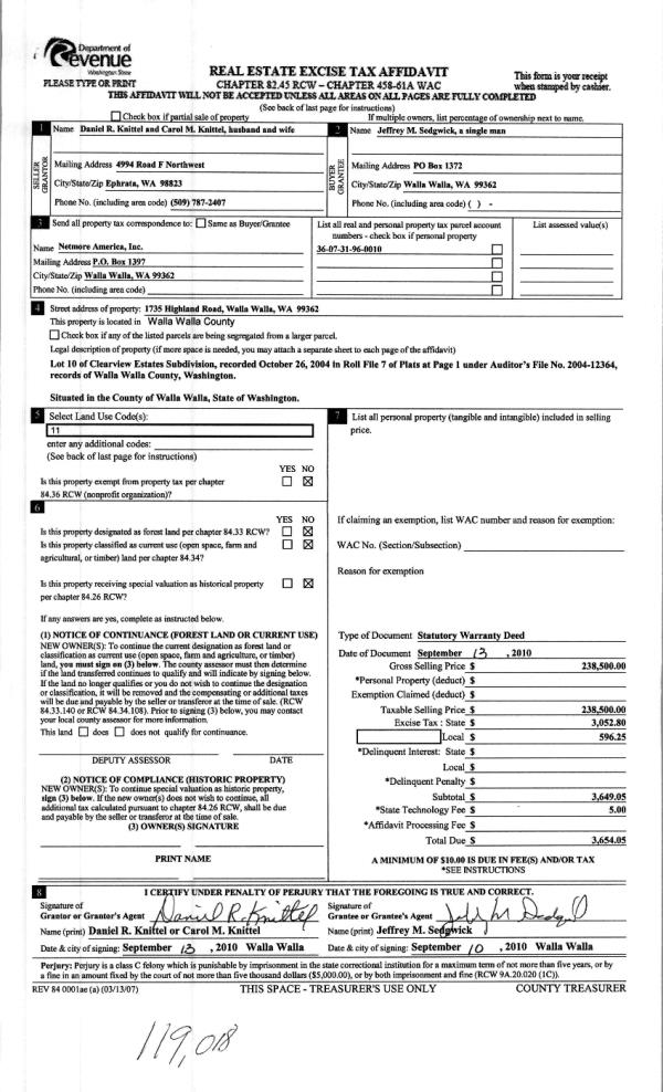 | 3 | 09/15/2010 | WARRANTY D | WARRANTY DEED | KNITTEL, DANIEL R & CAROL M | SEDGWICK, JEFFREY M | | | $238,500.00 | 119018 | 2010-07258 |