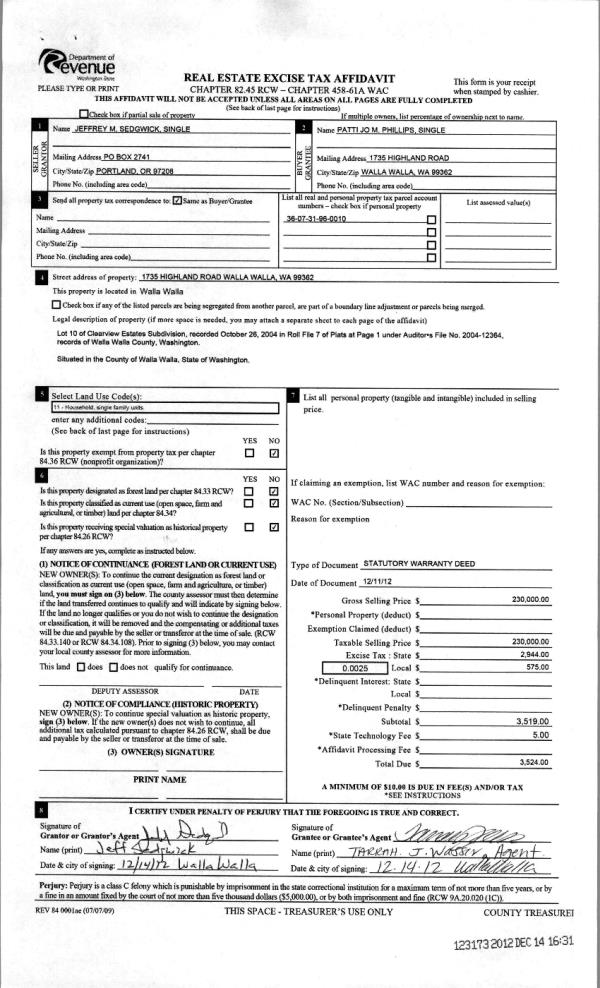 | 2 | 12/14/2012 | WARRANTY D | WARRANTY DEED | SEDGWICK, JEFFREY M | PHILLIPS, PATTI JO M | | | $230,000.00 | 123173 | 2012-11212 |