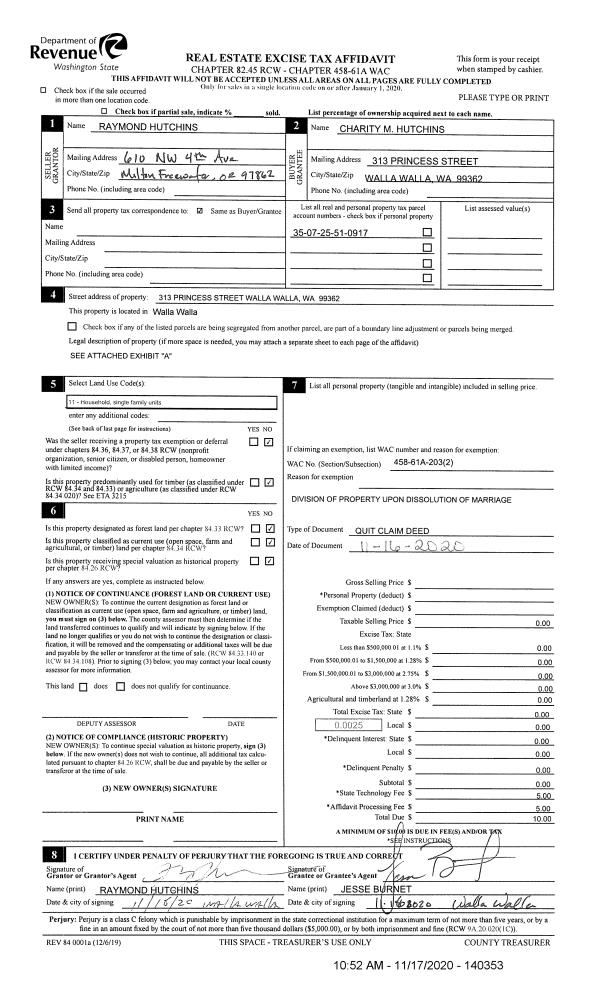 | 1 | 11/17/2020 | QCD | QUIT CLAIM DEED | HUTCHINS RAYMOND W & CHARITY | HUTCHINS CHARITY M | | | | 140353 | 2020-12134 |