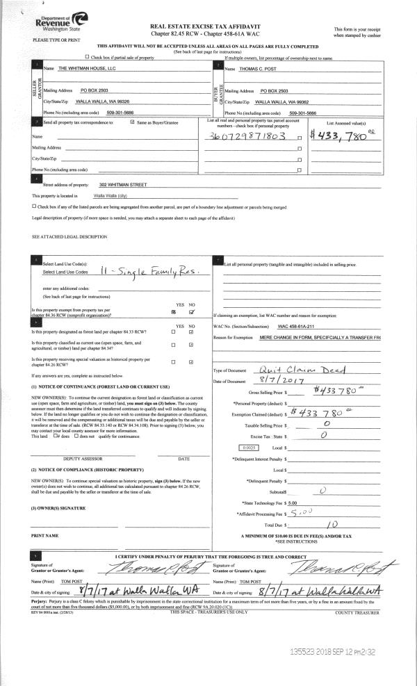 | 2 | 09/12/2018 | QCD | QUIT CLAIM DEED | THE WHITMAN HOUSE LLC | POST TOM C | | | $433,780.00 | 135523 | 2018-07611 |