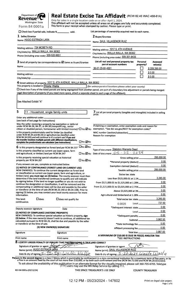 | 2 | 05/23/2024 | SWD | STATUTORY WARRANTY DEED | LARA HUGO ESTRADA | RUIZ SAUL VILLASENOR | | | $295,000.00 | 147602 | 2024-02729 |
